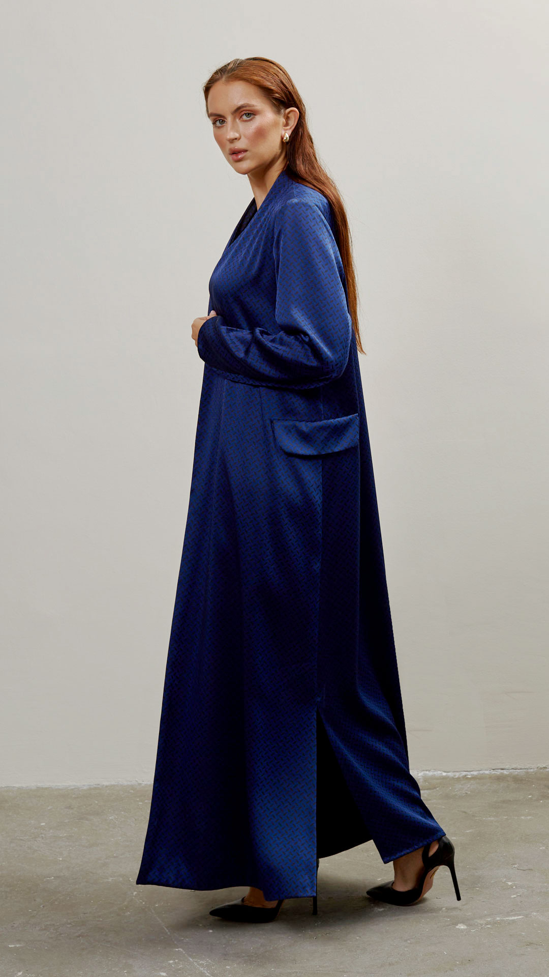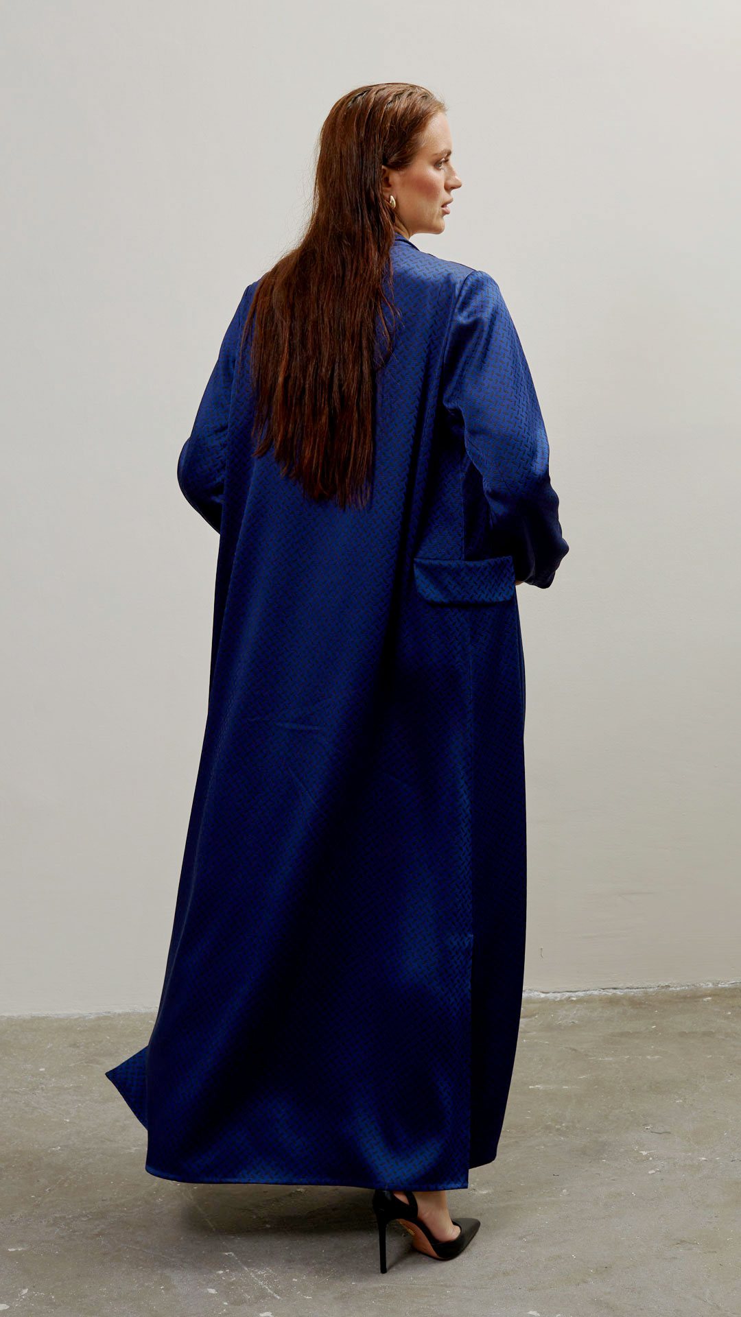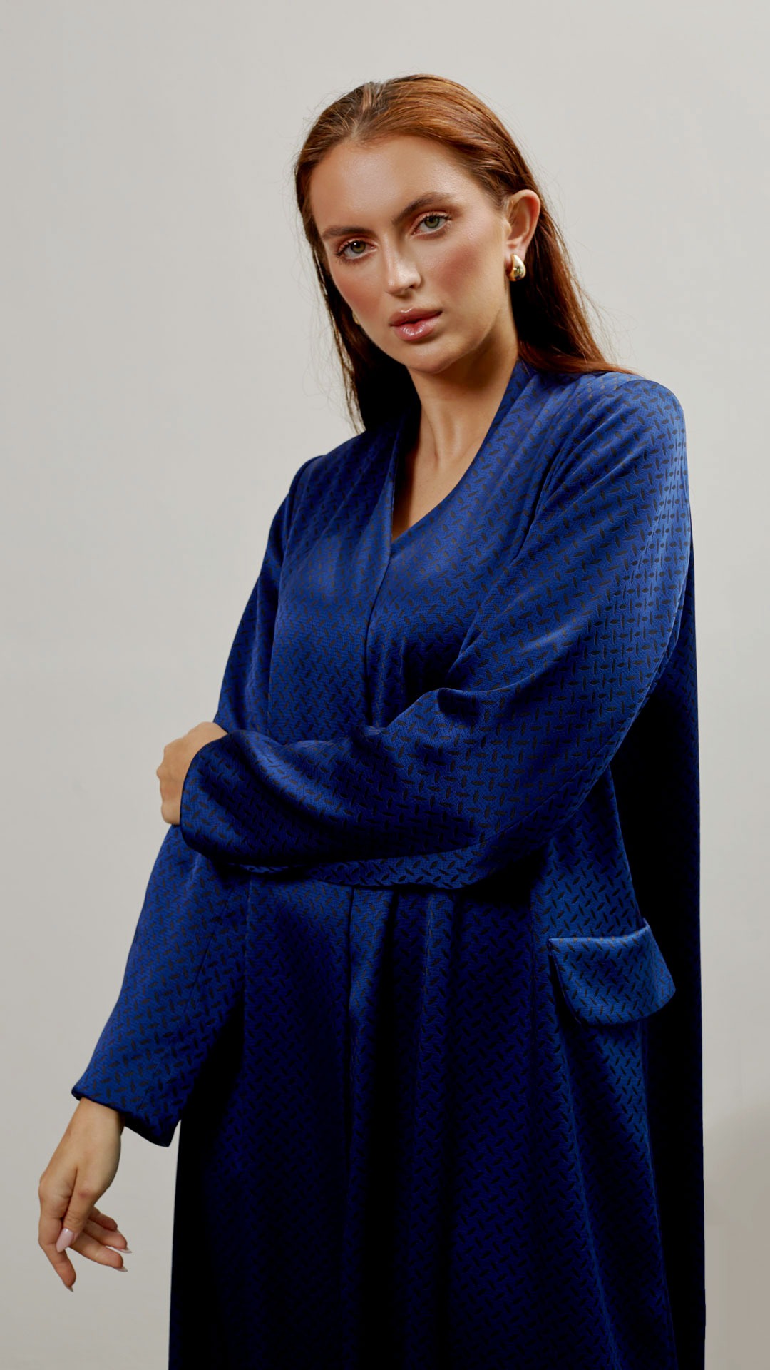Description • Side 1: Electric Blue & Black • Side 2: Navy Blue & Black • Italian jacquard • Reversible straight cut with slits on the sides • Dry clean Made in Qatar