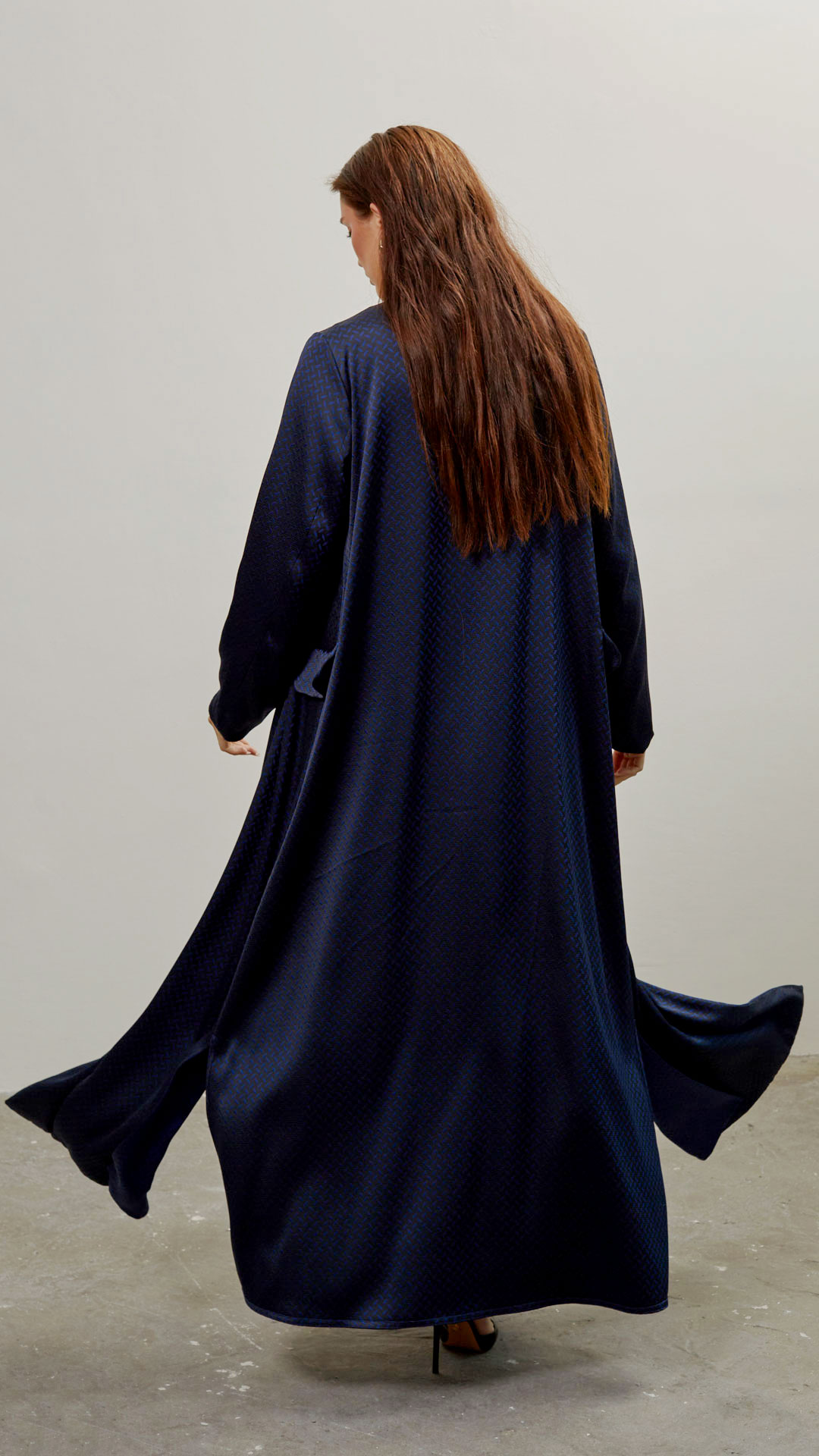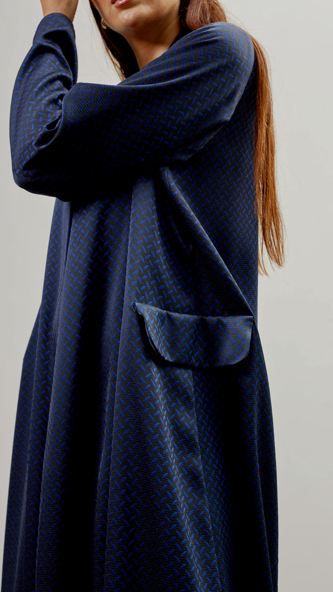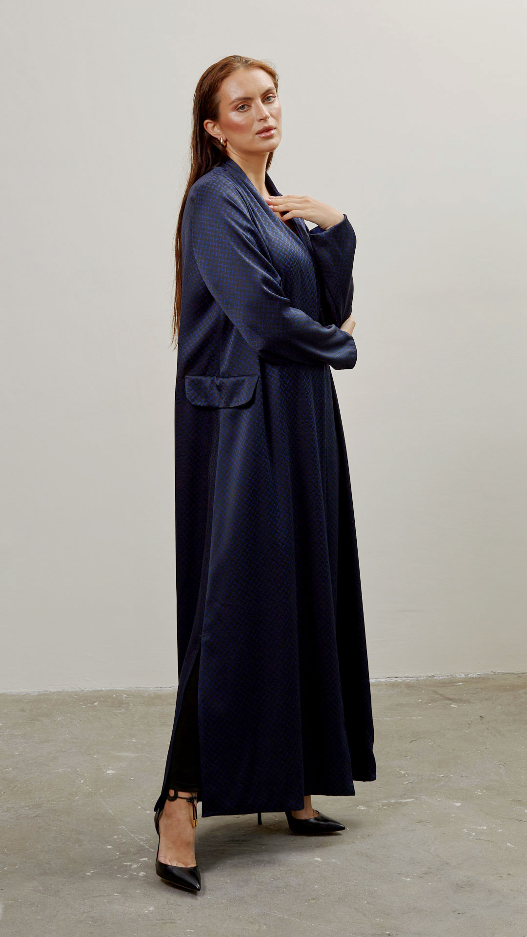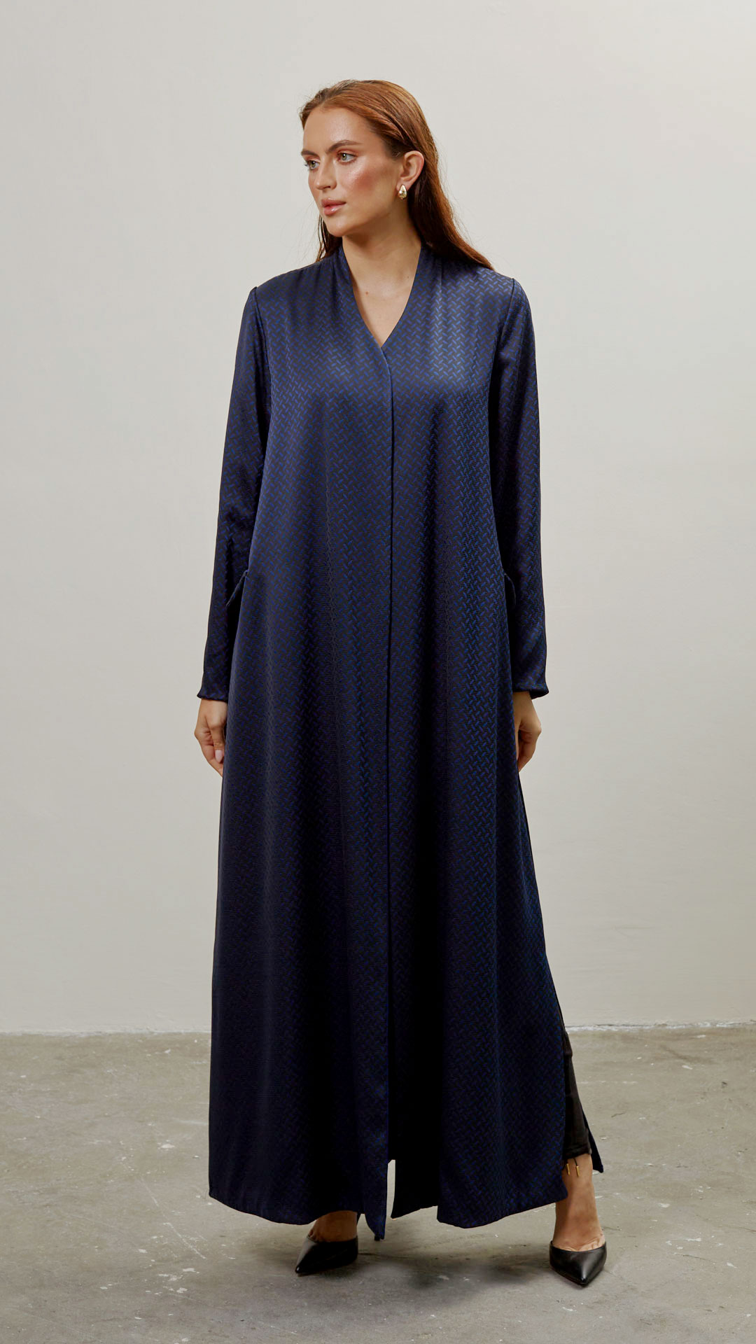 Description • Side 1: Electric Blue & Black • Side 2: Navy Blue & Black • Italian jacquard • Reversible straight cut with slits on the sides • Dry clean Made in Qatar